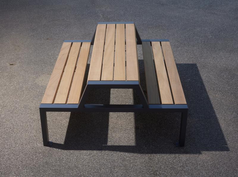 Die Bank-Tisch-Kombination, mit Laschen zum Aufdübeln. Stahlteile aus Rechteckrohr feuerverzinkt. Anlieferung teilmontiert. Ausführung in FSC® zertifiziertem Hartholz (SCS-COC-001802), unbehandelt