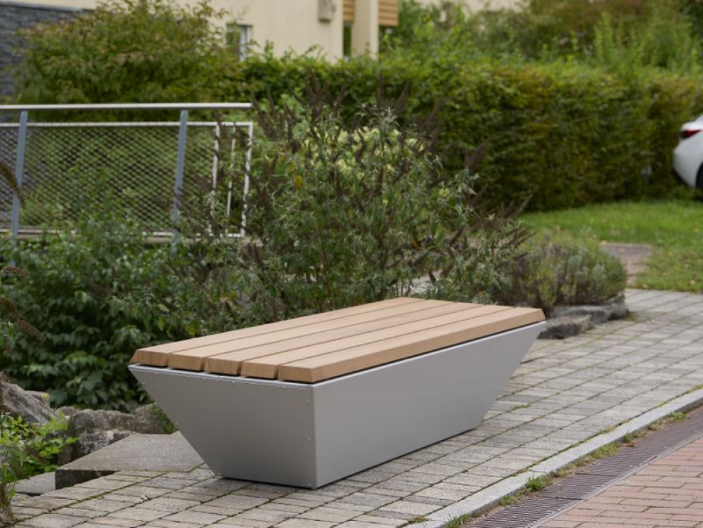 Der Unterbau besteht aus Flachstahl, feuerverzinkt und pulverbeschichtet. Standardfarbe: anthrazit-eisenglimmer, ähnl. DB 703. Die Sitzfläche besteht aus Holzleisten, in FSC®-zertifiziertem Hartholz (SCS-COC-001802), unbehandelt, zum Aufdübeln