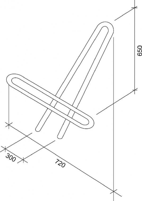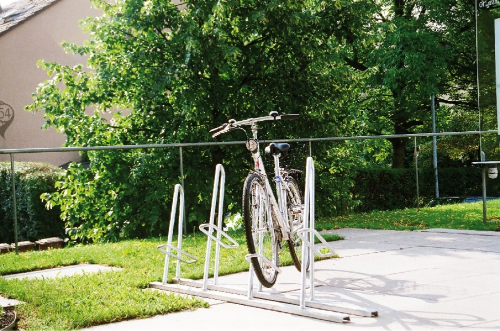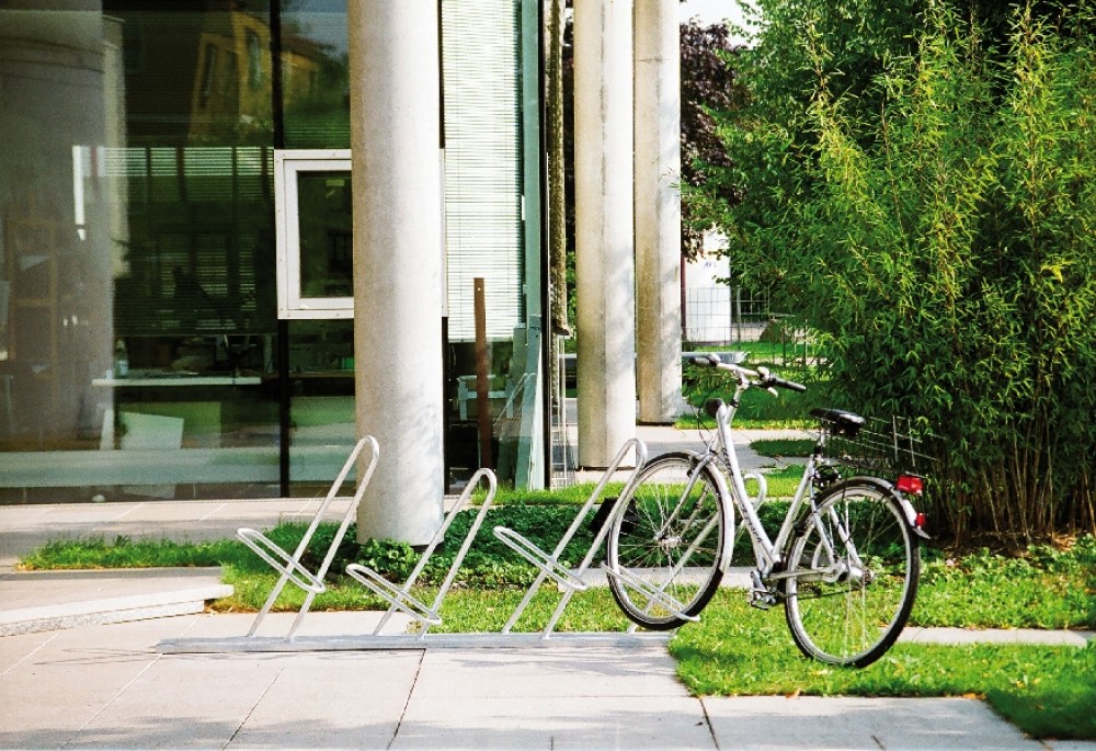 Kombination von Anlehnbügel und Stahlring zur Vorderradeinstellung, Bügel mit leichter Schräglage zur besseren Positionierung des Rades, leichte Anschließbarkeit des Fahrradrahmens, bei Reihenanlage mit Tief- oder Hoch-Tief-Einstellung. Einzelständer ca. 650 x 140 x 720 mm (H x B x T) feuerverzinkt, Durchmesser 27 bzw. 20 mm, Einzelständer zum Einbetonieren, Reihenanlage auf Profilrahmen zum Verdübeln (für Einstellung von rechtsschräg), Einstellabstand 500 mm bei tiefer bzw. 400 mm bei Hoch-Tief-Einstellung (an Profilrahmen gemessen).