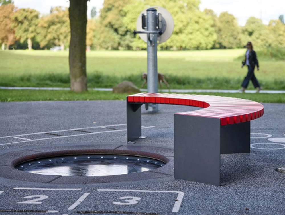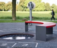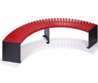 Rundbankelemente auf Stahlkonstruktion. Stahlgestelle aus Flachstahl, feuerverzinkt und pulverbescichtet, Standardfarbe anthrazit-eisenglimmer, ähnl. DB 703 . Auch als Bankauflage ohne Unterbau lieferbar, Ausführung ohne Rückenlehne.