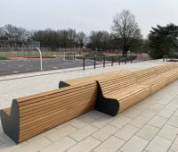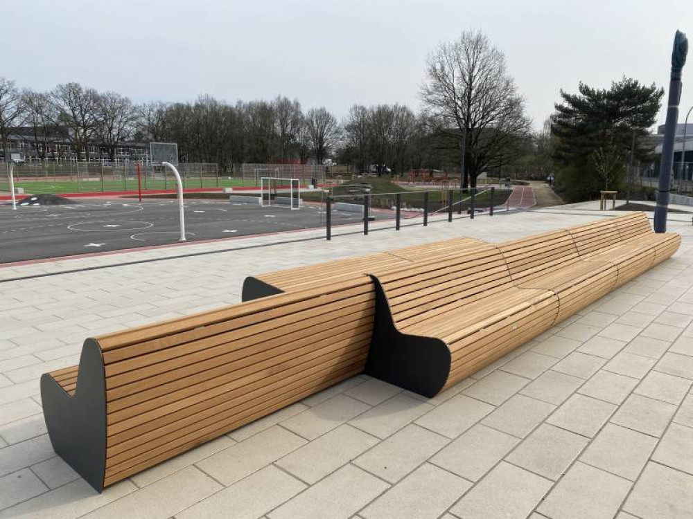 Der Willy-Brandt-Park in Norderstedt ist eine zentral gelegene Grünanlage und Naherholungsfläche. An den angrenzenden Sportplätzen erfolgte Anfang des Jahres die Erneuerung eines Platzes und Bestückung mit hochwertigen Sitzmöbeln. Aus der Bankserie SEDAN von Nusser Stadtmöbel wurden dafür mehrere Modelle ausgewählt: die Sitzbank, die doppelseitige Sitzbank und der Lounger mit verlängerter Sitzfläche, alle in DB 703 farbbeschichtet und mit langlebigem FSC®-Hartholz ausgestattet. Diese Möbel wurden in Reihe angeordnet und ergeben so einen langen, vielseitig nutzbaren Sitz- und Aufenthaltsbereich. Zugleich stellt diese Anordnung ein optisches Highlight dar und ist für sich schon ein Objekt.