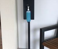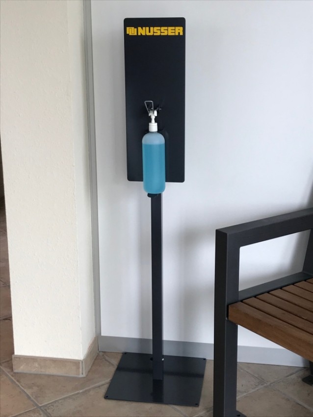 Immer noch ein akutes Thema und folglich ein sinnvolles Produkt: SANIQ, frei aufstellbarer Ständer mit Flaschenhalterung für Desinfektionsmittel. Der Ständer ist aus Stahl gefertigt und mit einer antibakteriellen Farbbeschichtung in RAL7024 graphitgrau versehen. Die Kunststoffflasche mit Spenderdüse hat ein Fassungsvermögen von 500 ml. SANIQ erhalten Sie ab 129,- € zzgl. Fracht und ges. MWSt. Bitte bestellen Sie einfach über das Kontaktformular auf unserer Website.