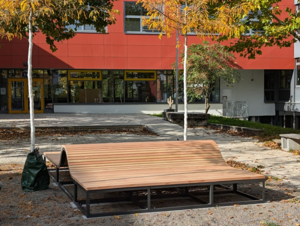 Das Georg-Büchner-Gymnasium in Winnenden hat 2024 seine Außenbereiche aufgewertet und hierbei unsere SINUS-Liegen eingesetzt. An mehreren Stellen wurden diese mit dreifacher Breite von ca. 2,7 m installiert. Dafür wurde das Untergestell geteilt und in Sonderanfertigung ausgeführt. So enstehen große Liege- und Aufenthaltsflächen, wie sie gerade an Schulen gerne genutzt werden. Aufgrund der regionalen Herkunft kam für dieses Projekt Douglasienholz aus dem Schwarzwald zum Einsatz.