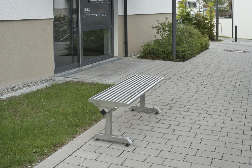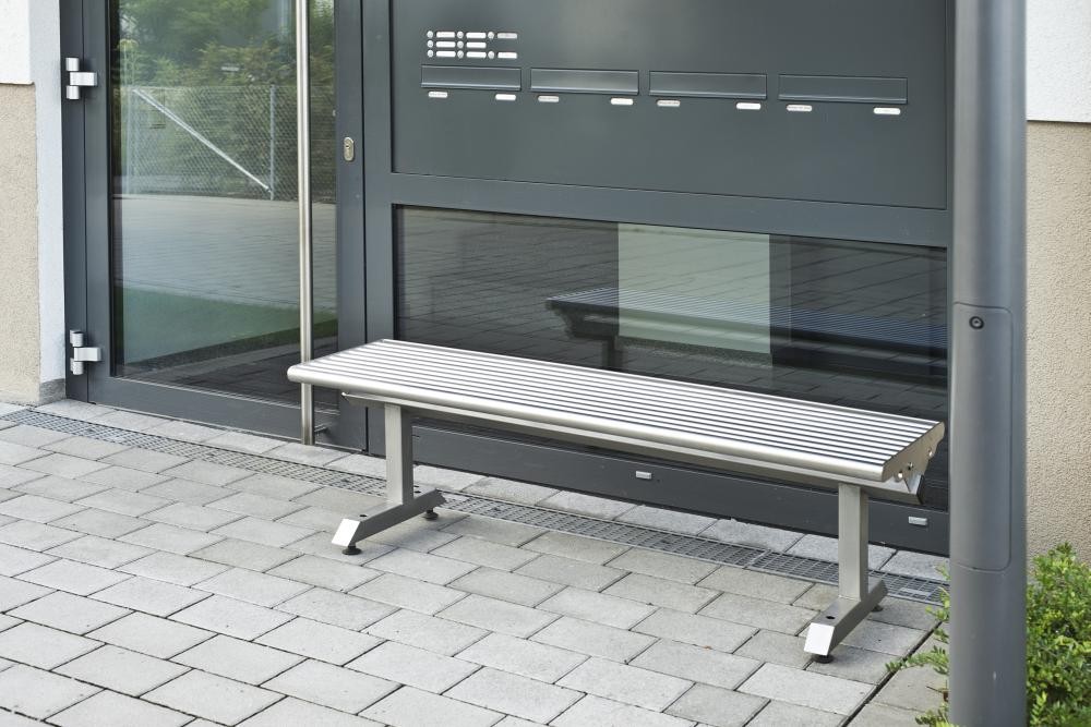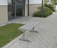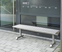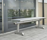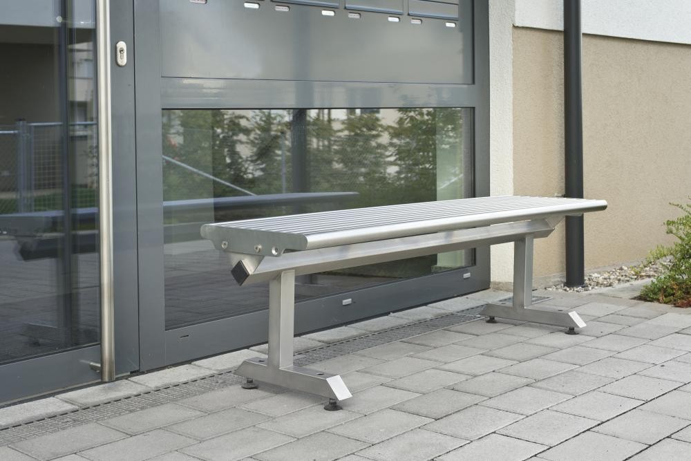 Very variable bench model. Support made of round tubing as a continuous bench on a straight substructure made of stainless steel, matt blasted and electropolished.