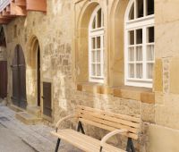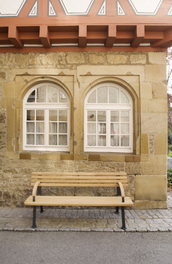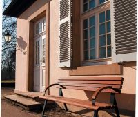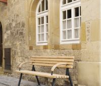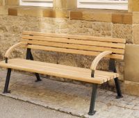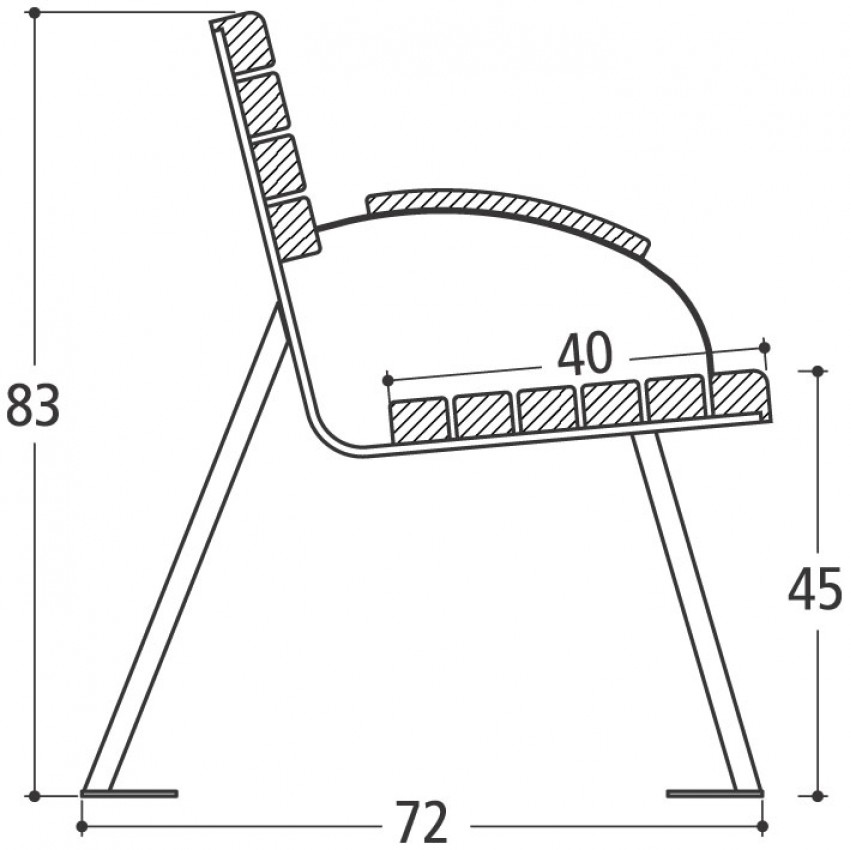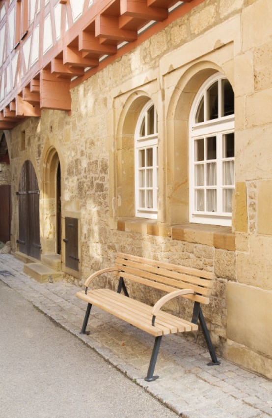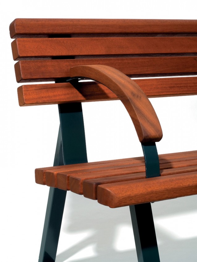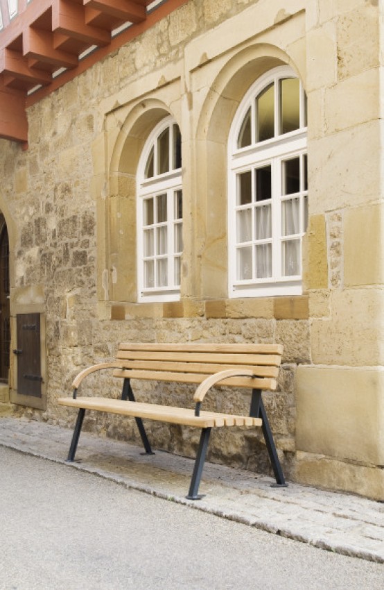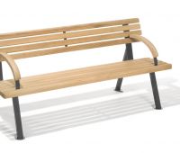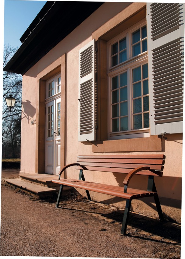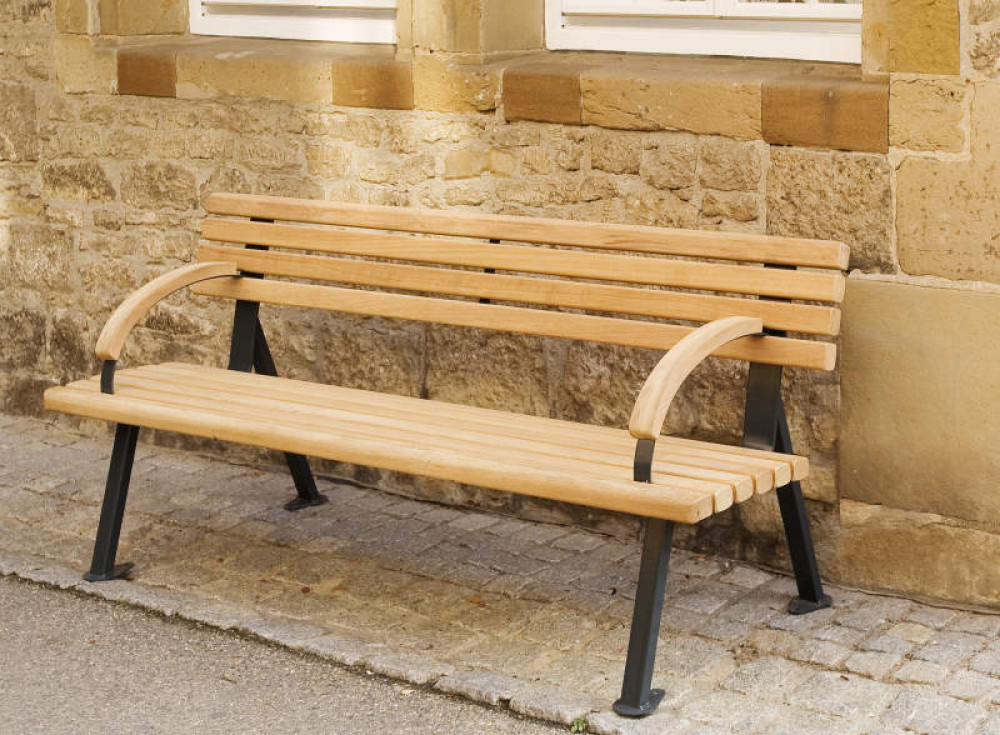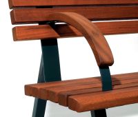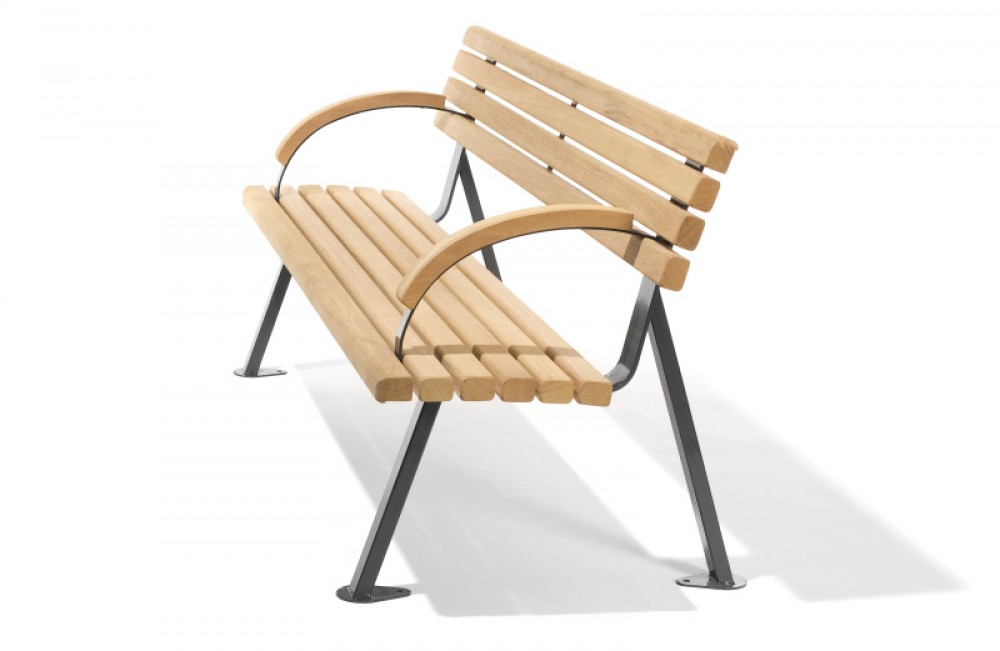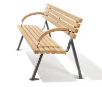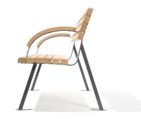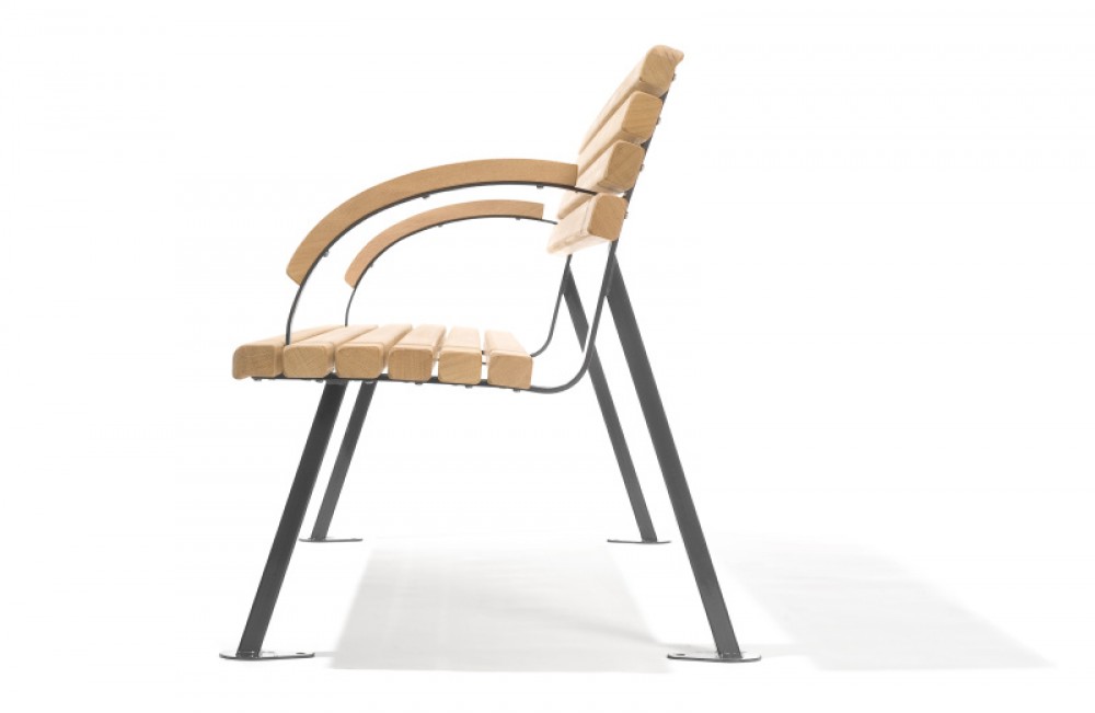 Bench with frame made from mild steel tube and curved flat steel, hot dip galvanized, optionally powder coated in dark metallic gray (like DB 703). Frame can be surface mounted.
