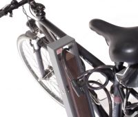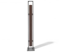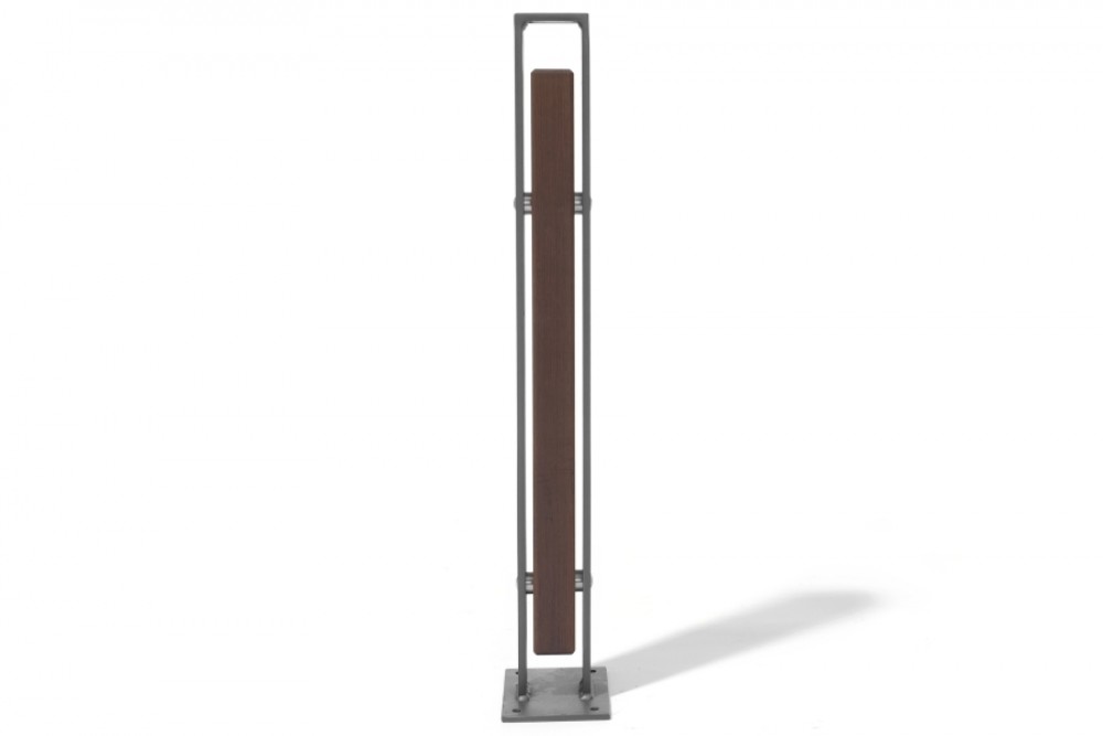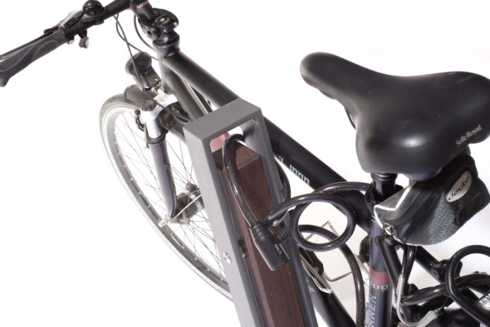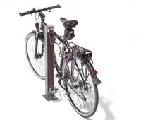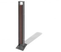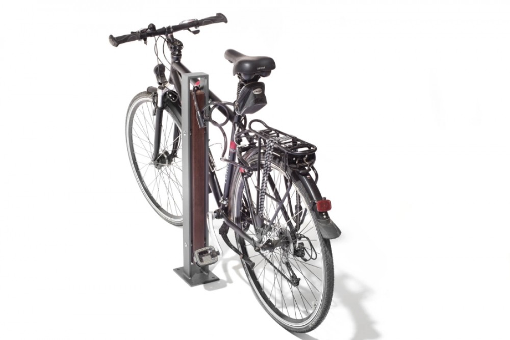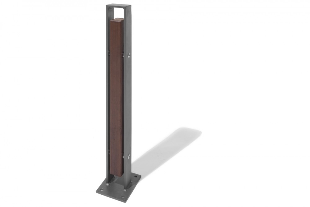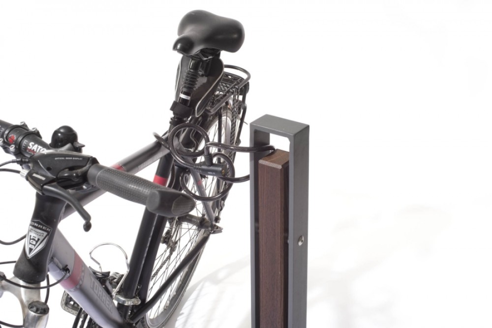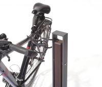 Bicycle stand with a wooden bar, made from flat steel bar (cross section: 60 x 10 mm), hot dip galvanized. Steel parts can be powder coated in RAL-/DB-colors. Stand normally embedded.