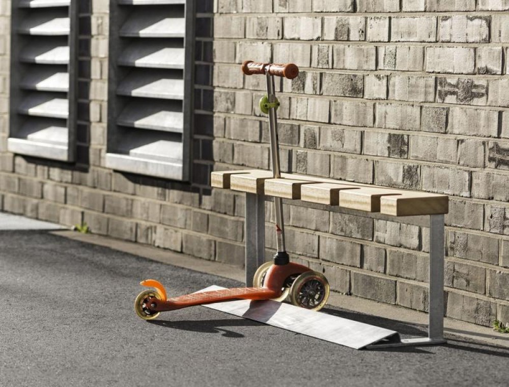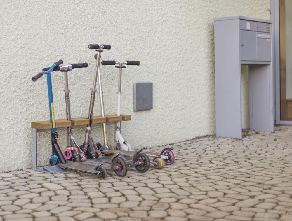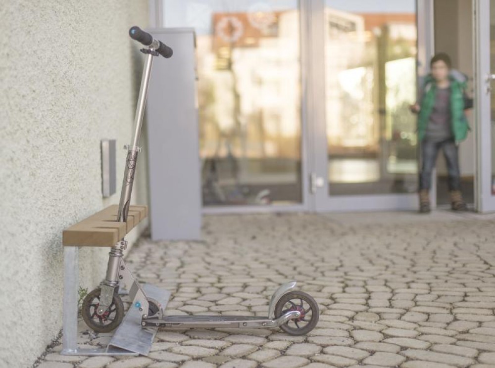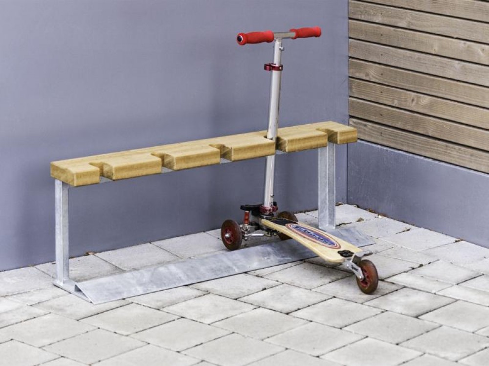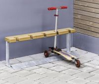 Parkingrack for scooters especially for designed kindergardens and schools. It is made for five scooters in a row and can be fixed on the ground. A wooden slat brings the scooter into position.