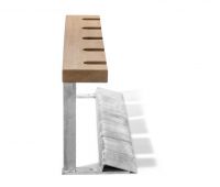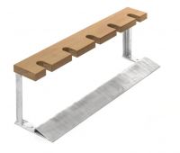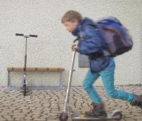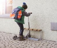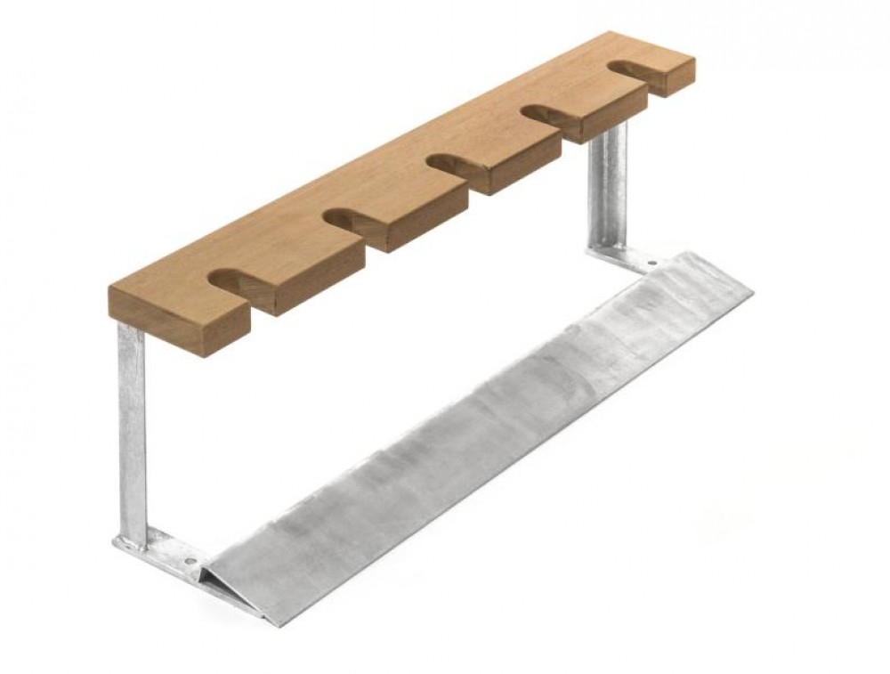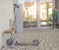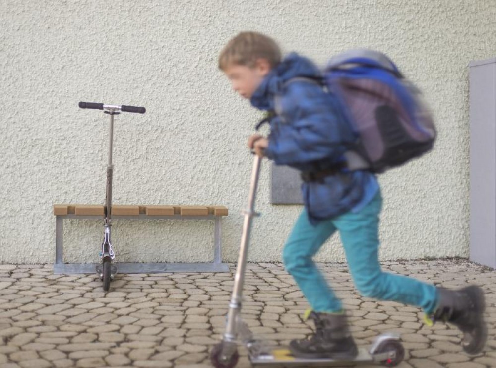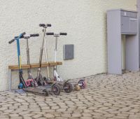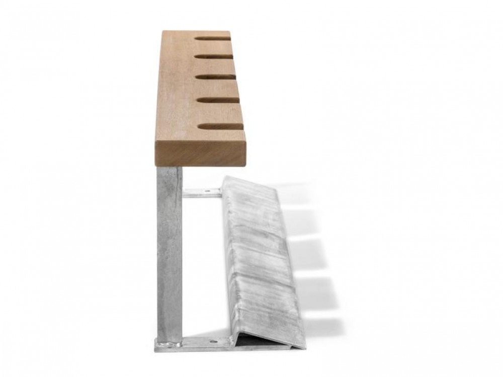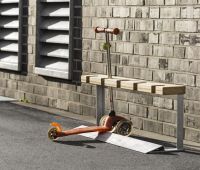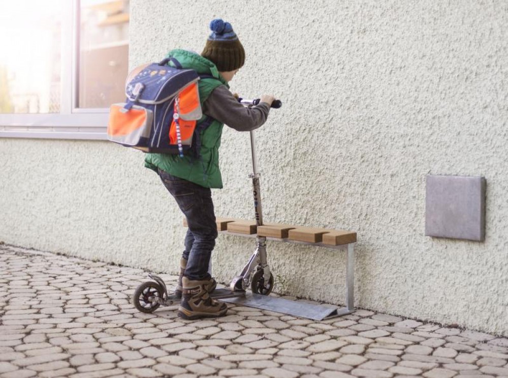 Parkingrack for scooters especially for designed kindergardens and schools. It is made for five scooters in a row and can be fixed on the ground. A wooden slat brings the scooter into position.