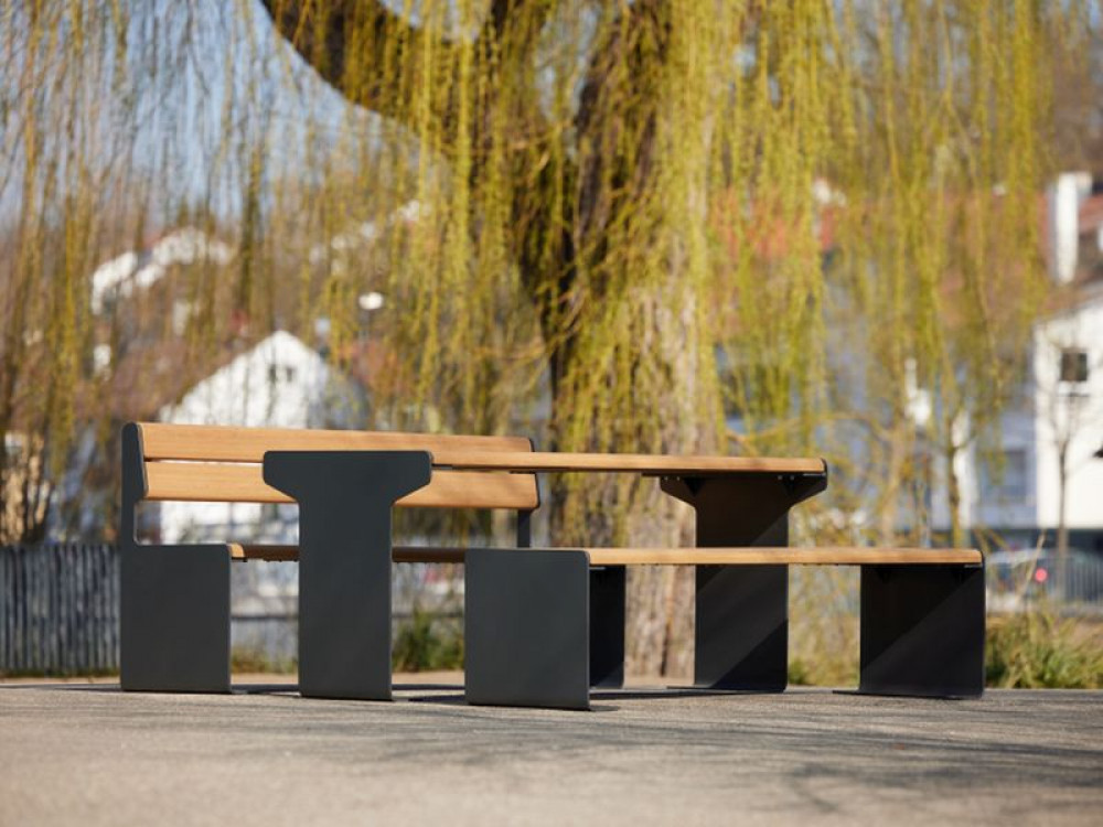 Modern table with rounded flat steel legs. Flat steel hot-dip galvanized and powder coated. Standard color anthracite micaceous iron oxide, similar to DB703. Stationary mounting possible.