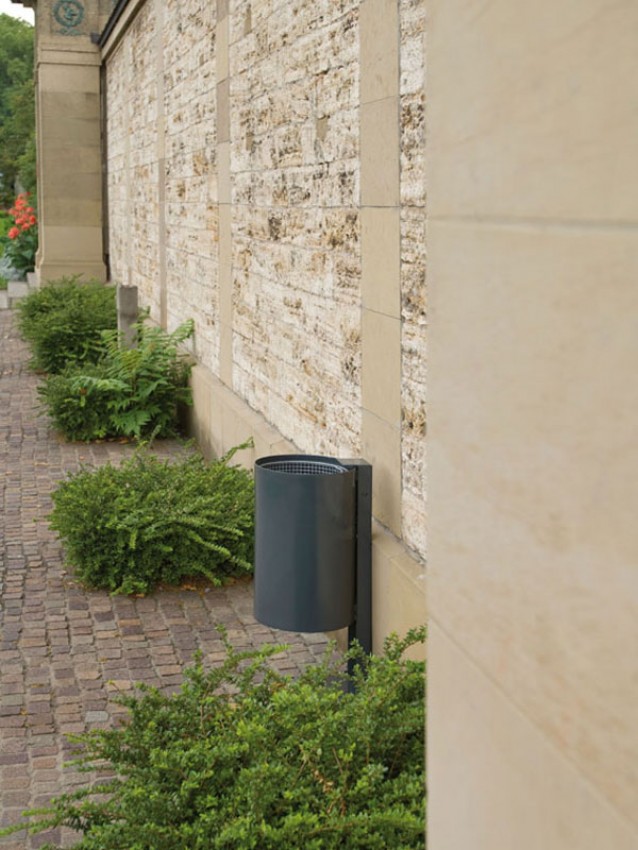 Litter bin for setting in concrete or wall mounting, round, capacity 35 (45, 60) l, diameter 300 mm (from 45 l: 340 mm), bin height 485 mm (60 l: 585 mm), height GOK 720 mm (60 l: 820 mm), U-profile support 110 x 45 mm, tilting mechanism with snap lock for quick disposal; installation height min. 220 (240) mm to bottom edge of bin.