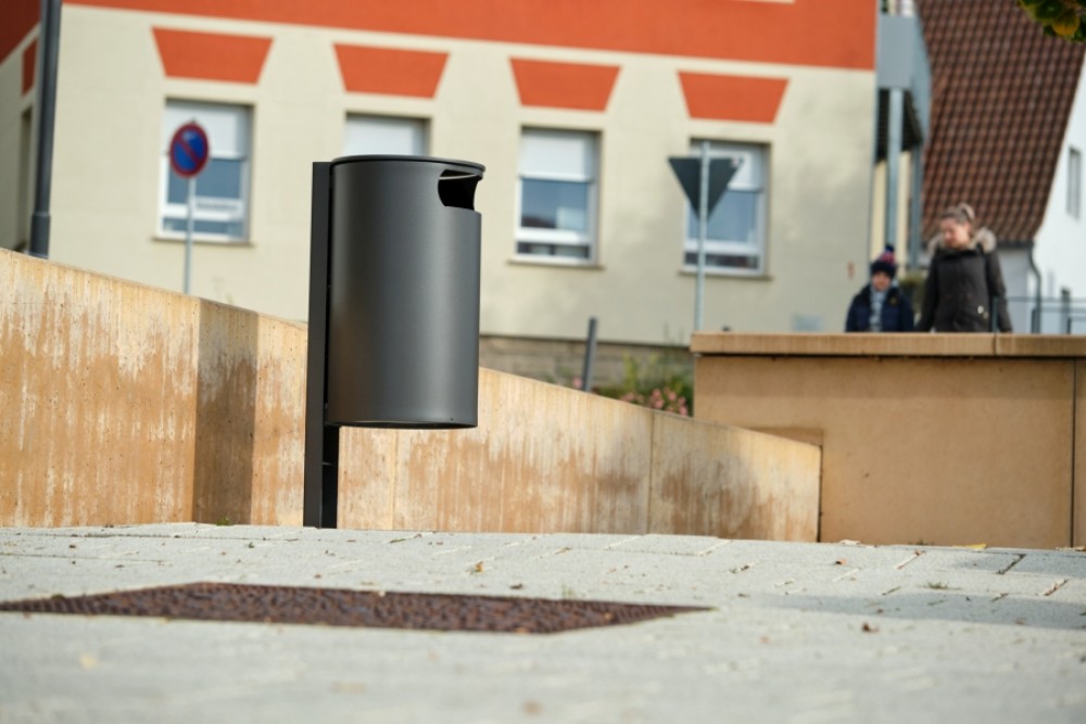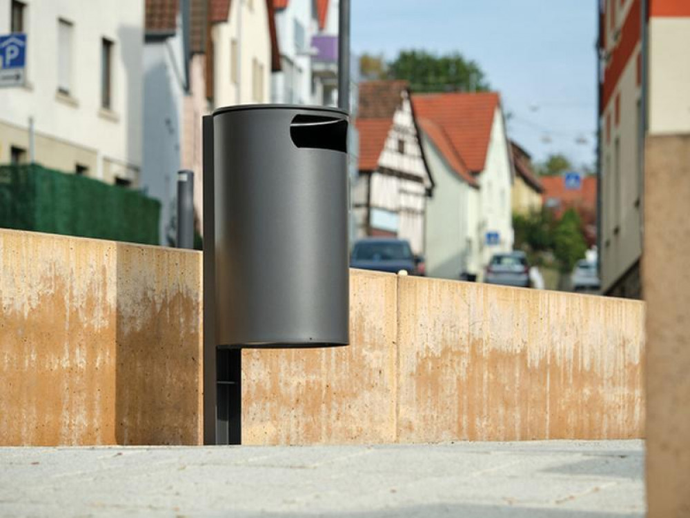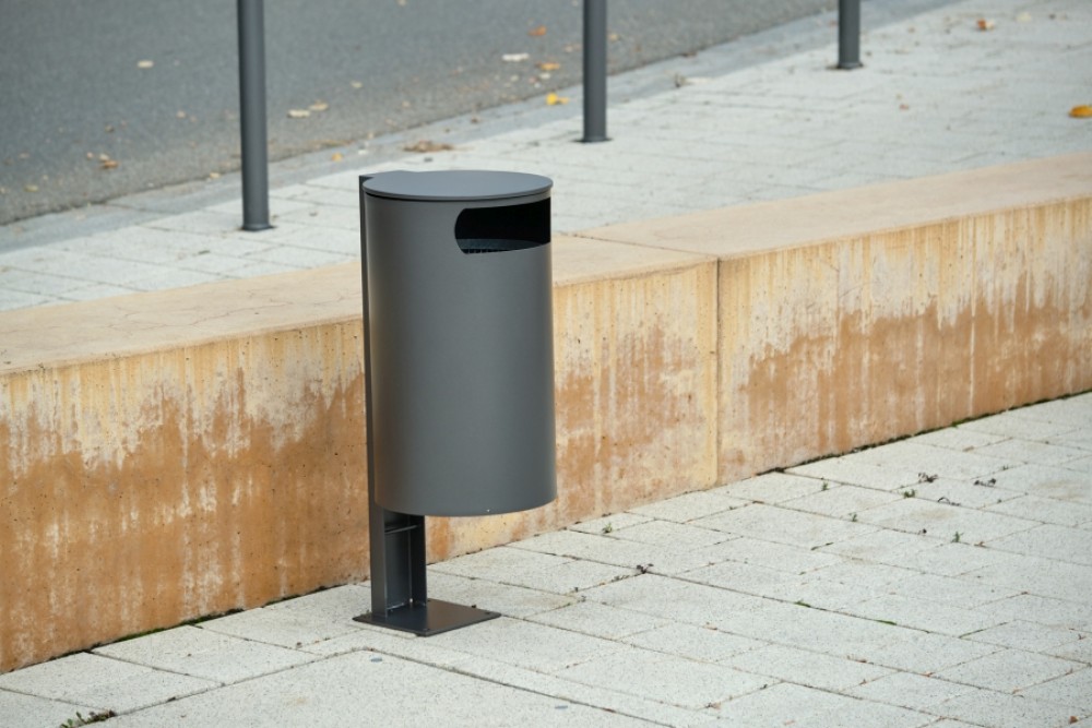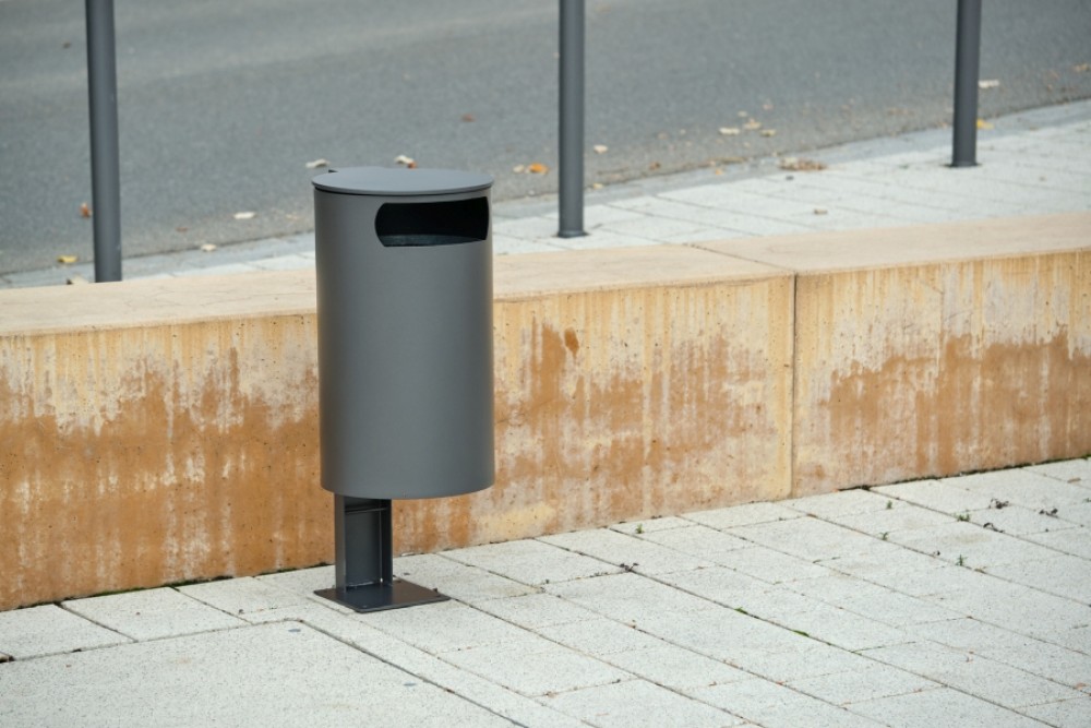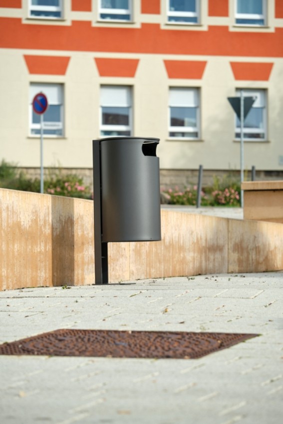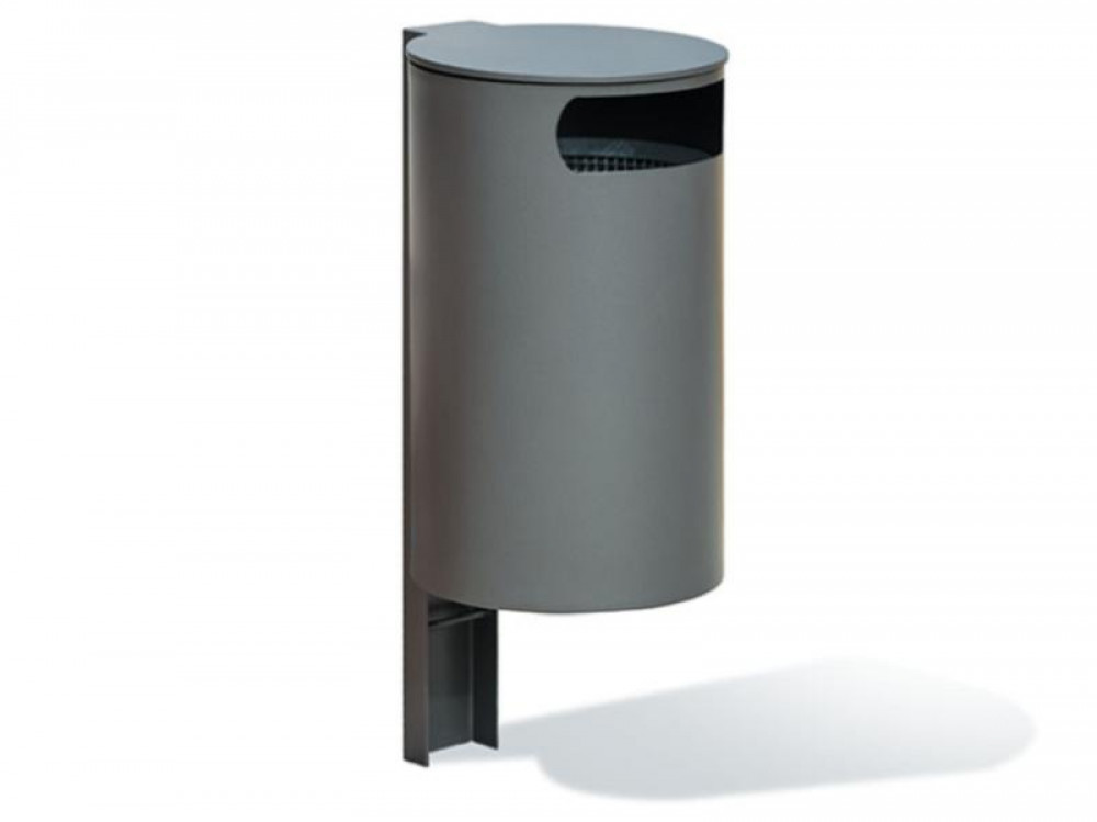 Litter Bin, round, with canopy flat roof on U-shaped post. Reduced opening on the front side.
